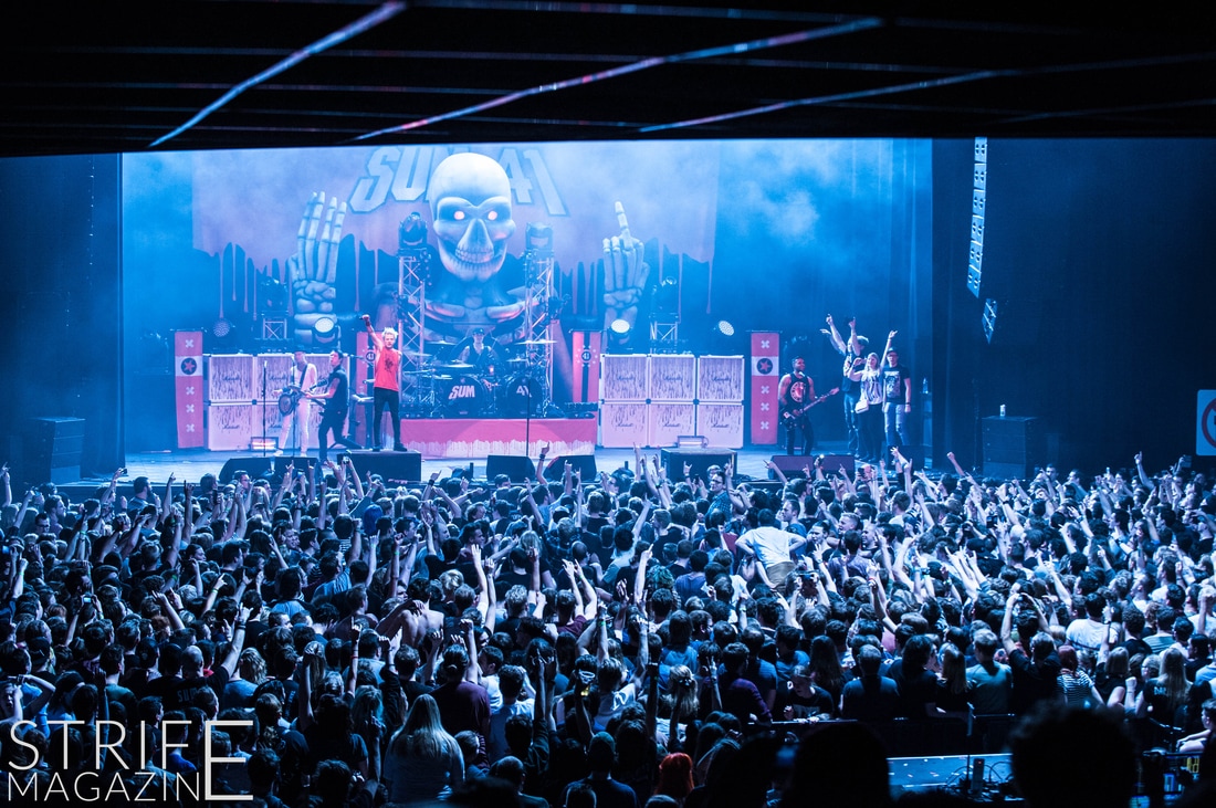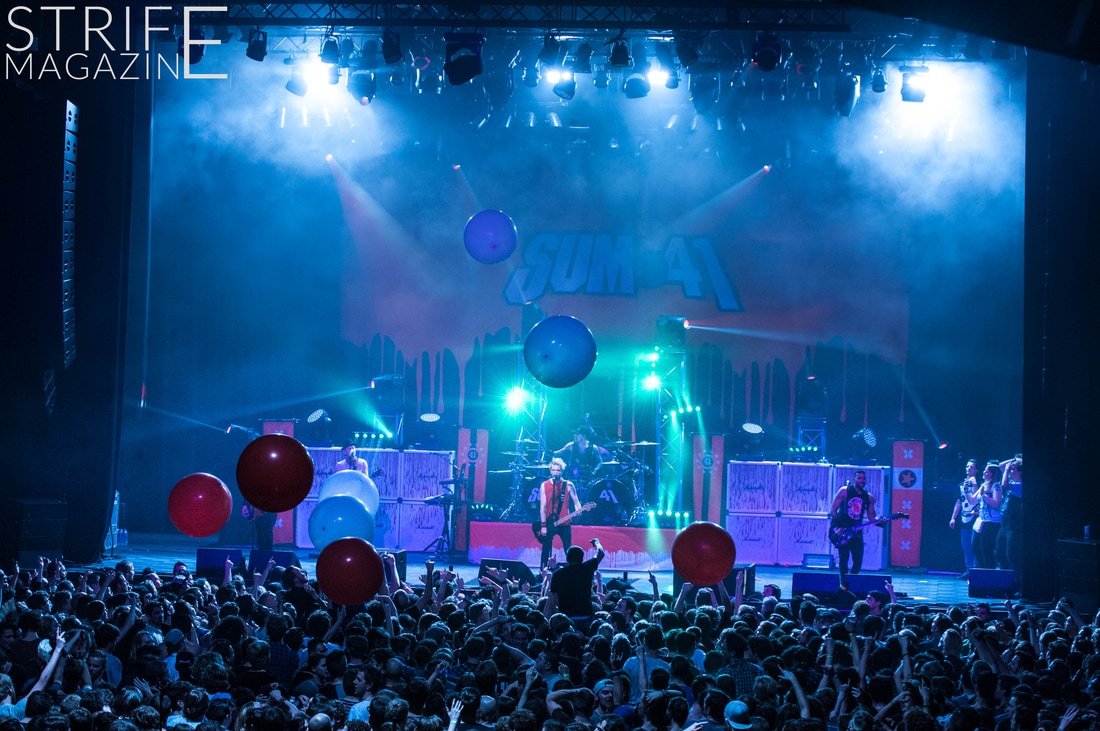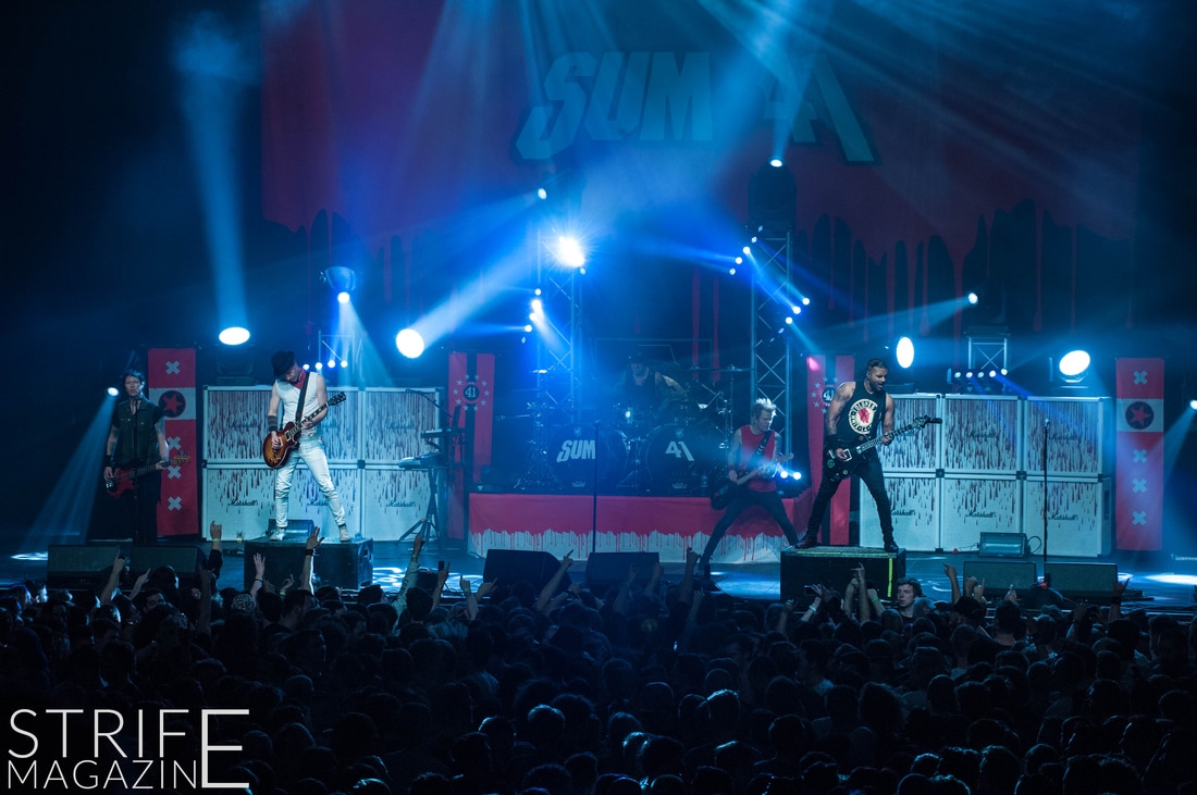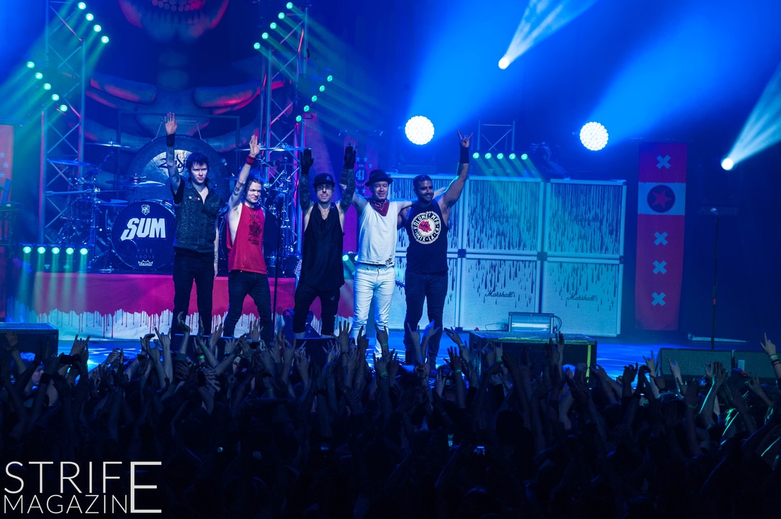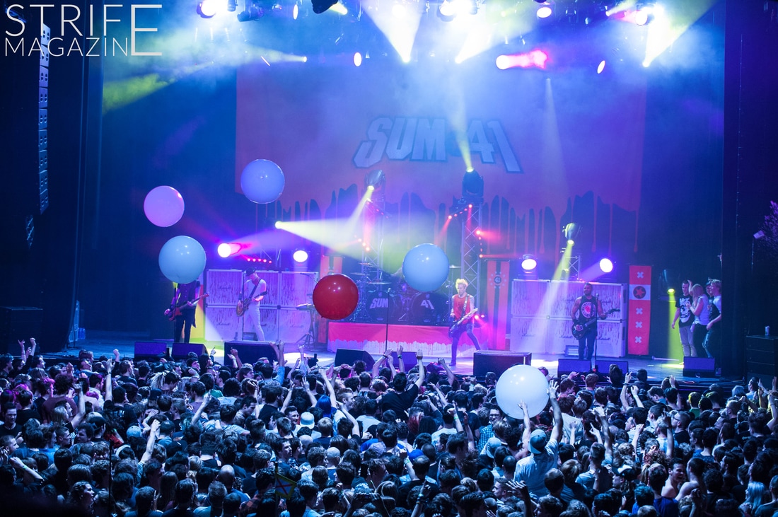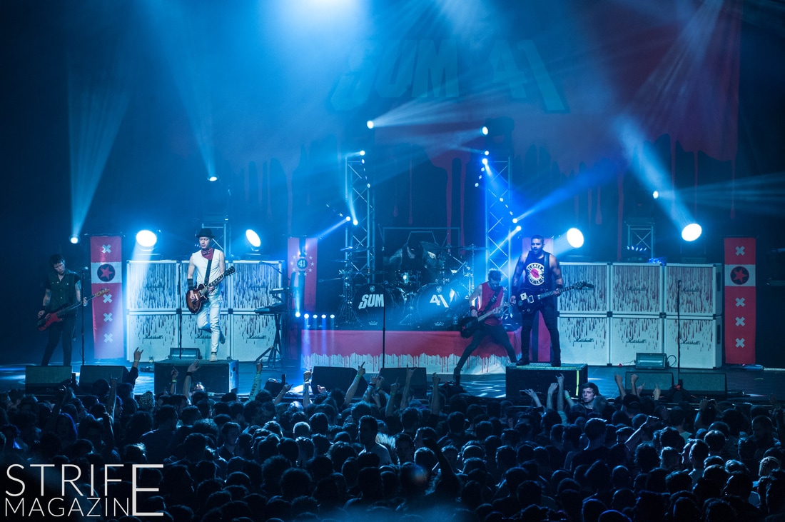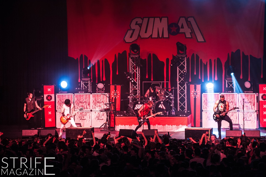 Sum 41 took their highly anticipated, long awaited album ’13 Voices’ to the European road to play a few of the biggest venues they’ve played all across Europe in their 20 year spanning career. Sum 41’s latest Dutch stop occured right before they announced the plans for their album ’13 Voices’ on which they played a rather small show for Sum 41 standards. While that was just a show to announce they’re back, this tour was a massive upgrade production wise on which they also had a huge amount of brand new tracks to perform live in front a sold out (in less than a day) crowd that was rowdier than ever. The band came out swinging like never before with a line-up consisting of 3 guitarists, new drummer Frank Zummo and of course Cone McCaslin on the bass, delivering exactly what you’d expect and want from the punkrockers at this point.
